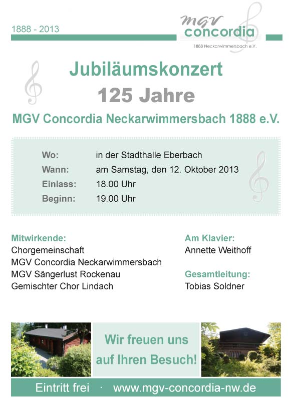 Am 12. Oktober 2013 werden diese 3 Chöre gemeinsam das 125jährige Bestehen des MGV Concordia Neckarwimmersbach mit einem abwechslungsreichen Konzert in der Stadthalle Eberbach unter der Schirmherrschaft unseres Bürgermeisters Peter Reichert gebührend feiern. Bei freiem Eintritt sind alle Mitbürgerinnen und Mitbürger herzlich eingeladen.