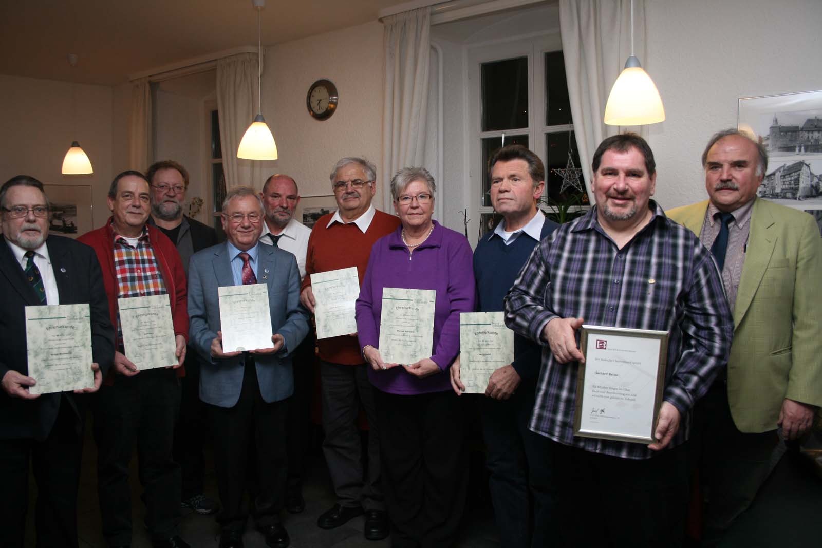 v.l.n.r. Armin Blutbacher, Rolf Dietz, 1. Vorstand Gerhard Laritz, Erhard Bartmann, 2. Vorstand Karlheinz Dir, Hüttenwart Josef Rumbach, Schriftführerin Marlies Rumbach, Karl Scheidl, Gerhard Beisel, 2. Vorstand Chorverband Heidelberg Wolfgang Haag