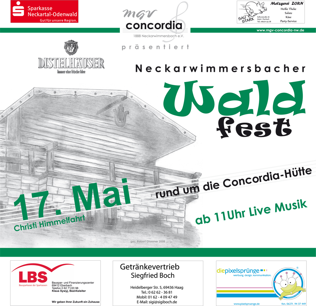 Der MGV Concordia Neckarwimmersbach veranstaltet am 17. Mai 2012 – Christi Himmelfahrtstag sein traditionelles Waldfest rund um die Concordia Hütte. Hierzu ist die Bevölkerung und alle Vatertags-Wanderer recht herzlich eingeladen